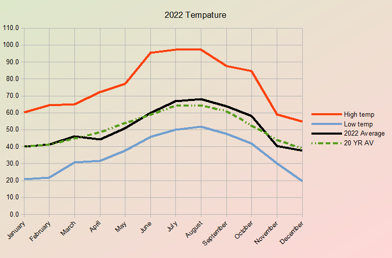 | year | month | High temp | Low temp | 2022 Average | 20 YR AV | ||||||||||||||||