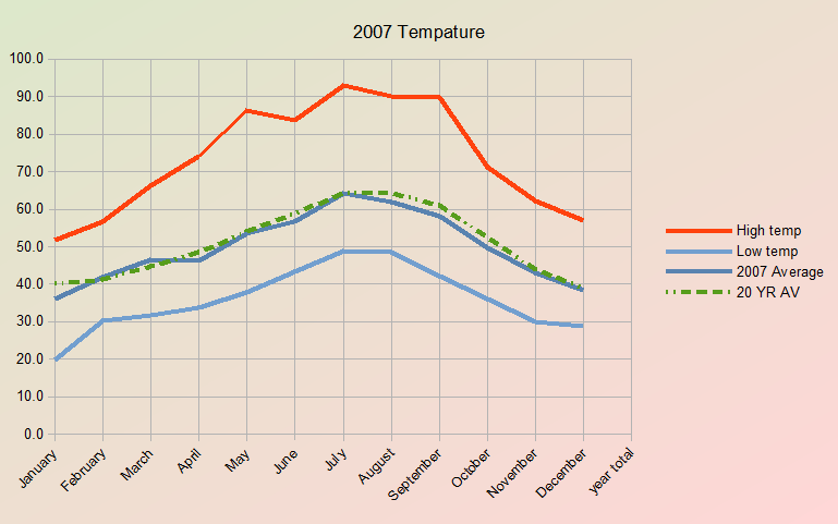 | year | month | High temp | Low temp | 2007 Average | 20 YR AV | ||||||||||||||||