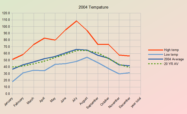 | year | month | High temp | Low temp | 2004 Average | 20 YR AV | ||||||||||||||||