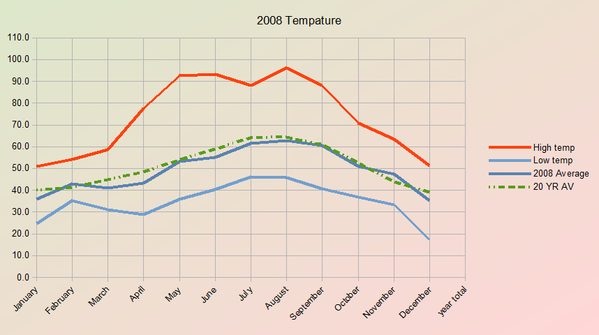 | year | month | High temp | Low temp | 2008 Average | 20 YR AV | ||||||||||||||||