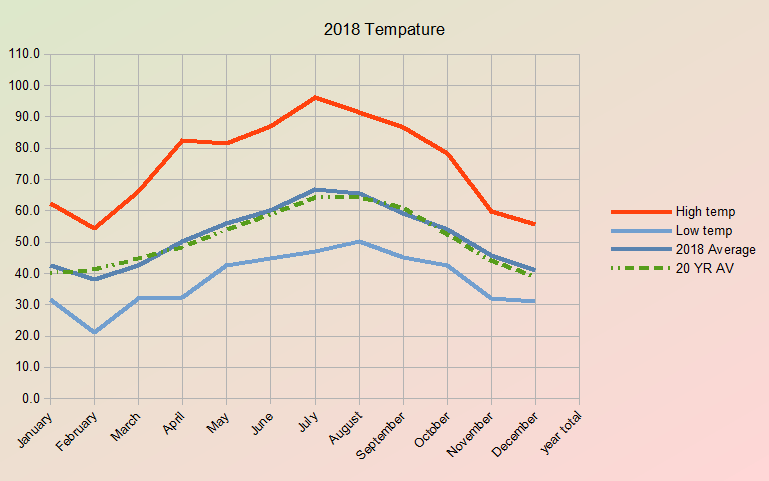 | year | month | High temp | Low temp | 2018 Average | 20 YR AV | ||||||||||||||||