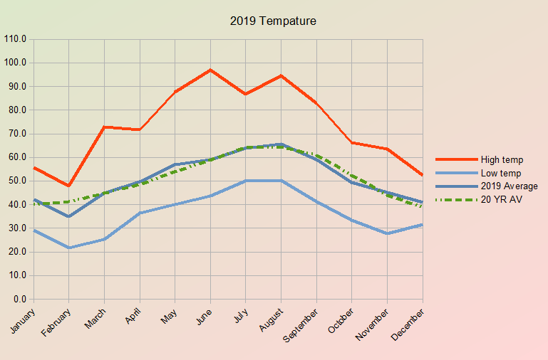 | year | month | High temp | Low temp | 2019 Average | 20 YR AV | ||||||||||||||||