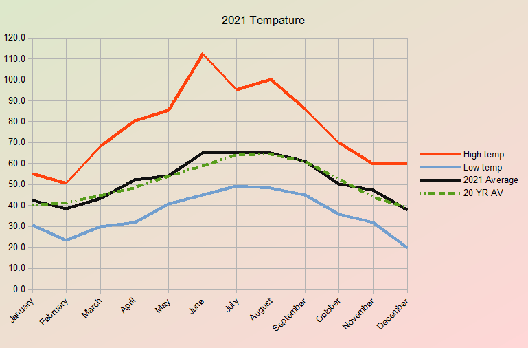 | year | month | High temp | Low temp | 2021 Average | 20 YR AV | ||||||||||||||||