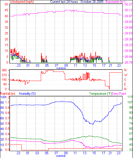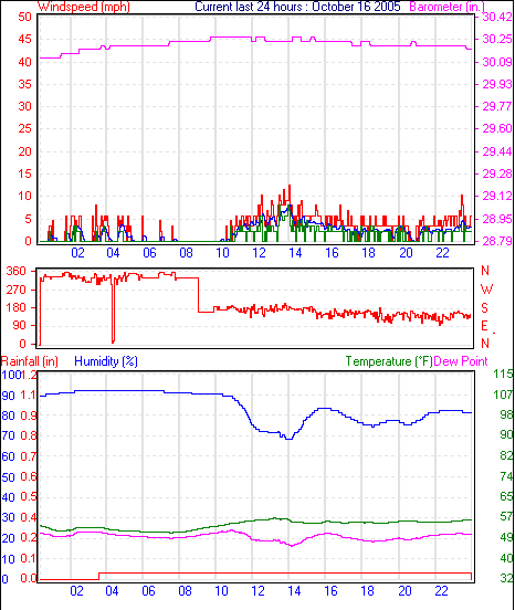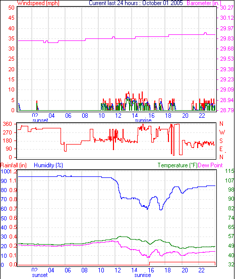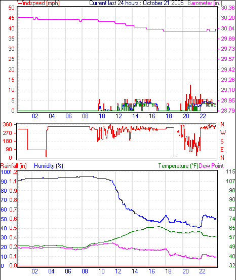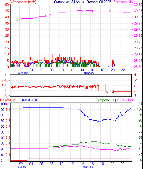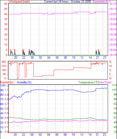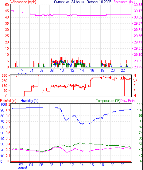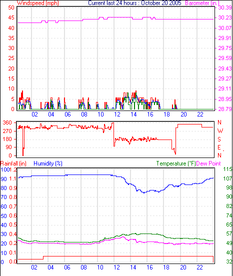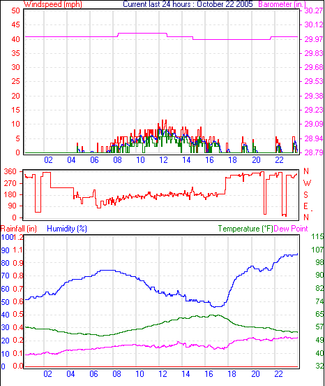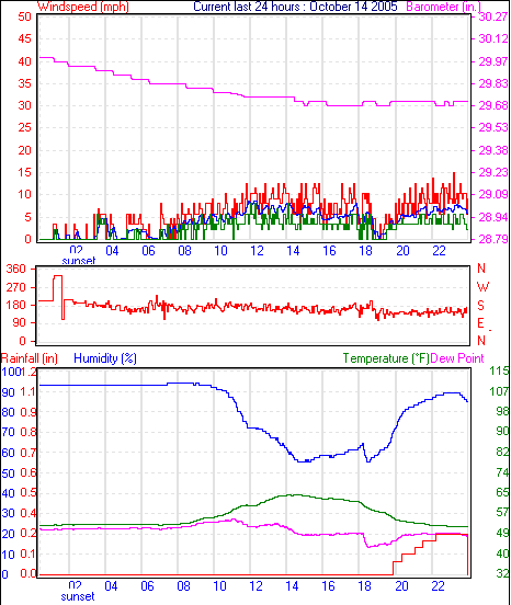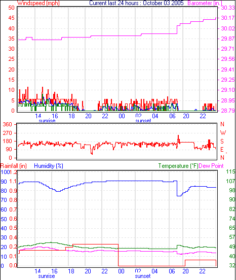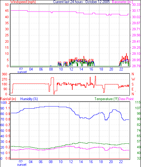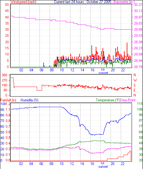 Averages\Extremes for the month of October to 31 2005 --------------------------------------------------- Average temperature 52.8 °F (11.6 °C) Average humidity 82 % Average dewpoint 47.0 °F (8.3 °C) Average barometer 30.045 in. Average windspeed 2.2 mph Average gustspeed 3.2 mph Average direction 166 ° (SSE) Rainfall for month 3.898 in. (97 mm) Rainfall for year 5.236 in. (131 mm) ----------------------------------------------------------- Maximum rain per minute 0.079 in. ( 2 mm) on day 31 at time 06:20 Maximum temperature 66.7 °F (19.3 °C) on day 21 at time 17:18 Minimum temperature 38.5 °F (3.6 °C) on day 27 at time 08:11 Maximum humidity 97 % on day 08 at time 03:06 Minimum humidity 41 % on day 21 at time 22:03 Minimum pressure 29.648 in. on day 15 at time 06:41 Maximum pressure 30.386 in. on day 30 at time 11:24 Maximum windspeed 14.0 mph from 179 on day 25 at time 17:00 Maximum gust speed 23.0 mph from 174 on day 25 at time 16:42 Maximum heat index 79.2 °F (26.2 °C)on day 22 at time 17:21 Growing degrees days : 156.4 °F ------------------------------------------------------------ Daily rain totals 0.039 in. (1.0 mm) on day 1 0.276 in. (6.9 mm) on day 2 0.079 in. (2.0 mm) on day 3 0.039 in. (1.0 mm) on day 6 0.394 in. (9.9 mm) on day 7 0.118 in. (3.0 mm) on day 8 0.039 in. (1.0 mm) on day 9 0.118 in. (3.0 mm) on day 13 0.236 in. (5.9 mm) on day 14 0.079 in. (2.0 mm) on day 15 0.039 in. (1.0 mm) on day 16 0.039 in. (1.0 mm) on day 19 0.079 in. (2.0 mm) on day 20 0.118 in. (3.0 mm) on day 25 0.039 in. (1.0 mm) on day 26 0.197 in. (4.9 mm) on day 27 0.236 in. (5.9 mm) on day 28 0.197 in. (4.9 mm) on day 29 0.197 in. (4.9 mm) on day 30 ------------------------------------------------------------
