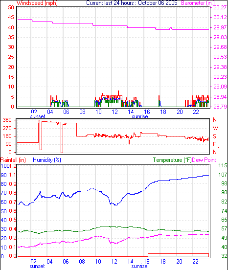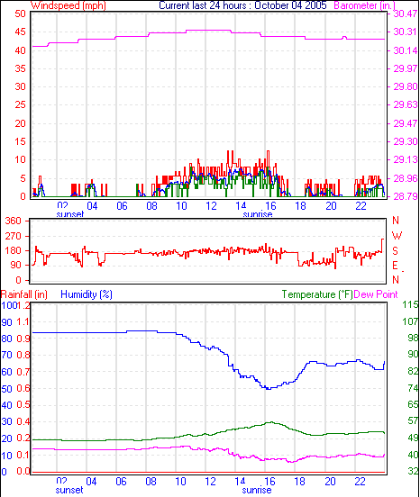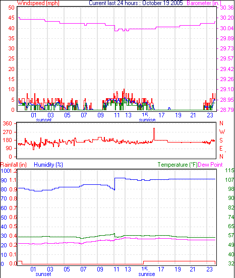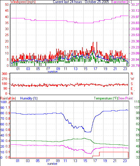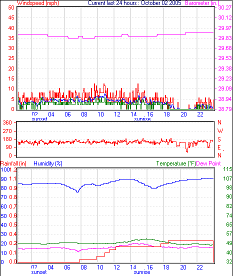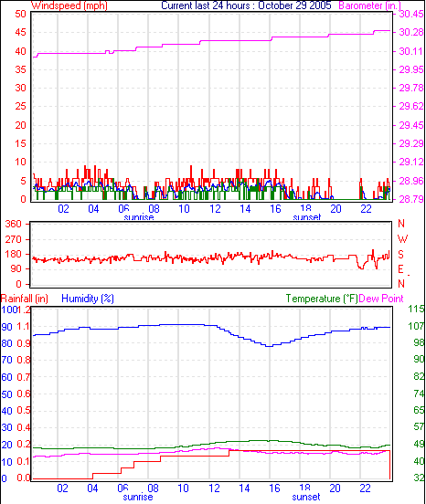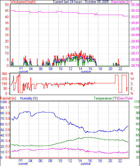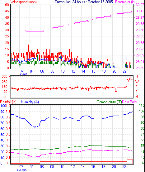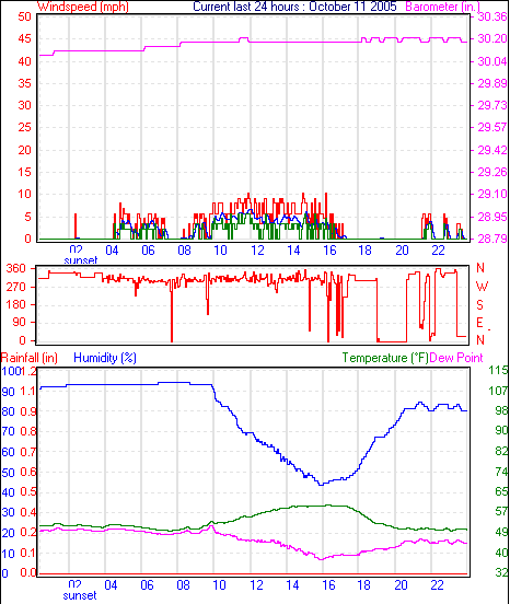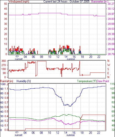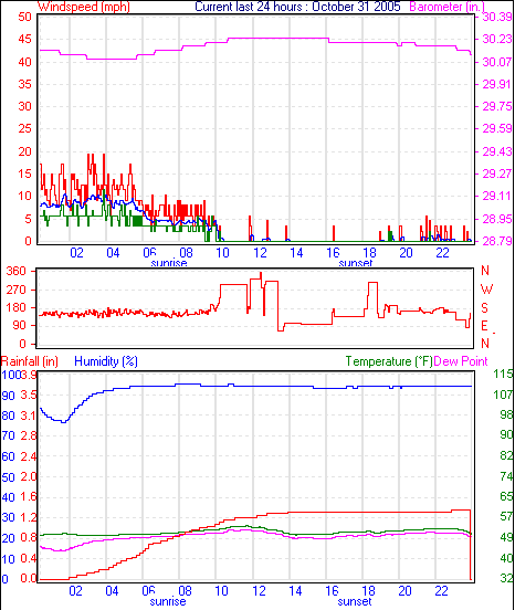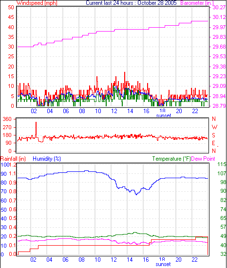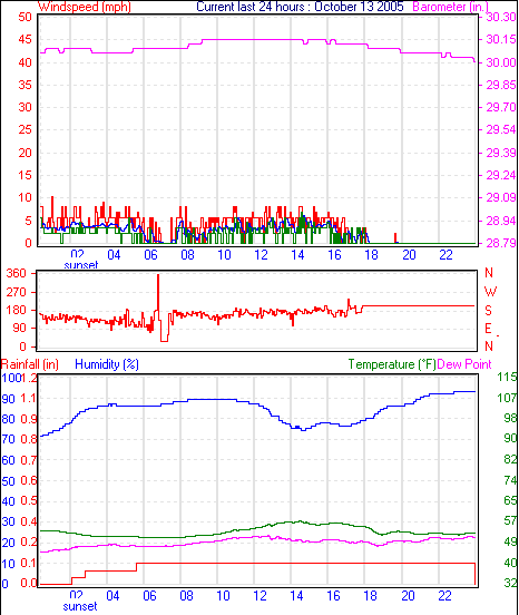 Averages\Extremes for the month of October to 31 2005 --------------------------------------------------- Average temperature 52.8 °F (11.6 °C) Average humidity 82 % Average dewpoint 47.0 °F (8.3 °C) Average barometer 30.045 in. Average windspeed 2.2 mph Average gustspeed 3.2 mph Average direction 166 ° (SSE) Rainfall for month 3.898 in. (97 mm) Rainfall for year 5.236 in. (131 mm) ----------------------------------------------------------- Maximum rain per minute 0.079 in. ( 2 mm) on day 31 at time 06:20 Maximum temperature 66.7 °F (19.3 °C) on day 21 at time 17:18 Minimum temperature 38.5 °F (3.6 °C) on day 27 at time 08:11 Maximum humidity 97 % on day 08 at time 03:06 Minimum humidity 41 % on day 21 at time 22:03 Minimum pressure 29.648 in. on day 15 at time 06:41 Maximum pressure 30.386 in. on day 30 at time 11:24 Maximum windspeed 14.0 mph from 179 on day 25 at time 17:00 Maximum gust speed 23.0 mph from 174 on day 25 at time 16:42 Maximum heat index 79.2 °F (26.2 °C)on day 22 at time 17:21 Growing degrees days : 156.4 °F ------------------------------------------------------------ Daily rain totals 0.039 in. (1.0 mm) on day 1 0.276 in. (6.9 mm) on day 2 0.079 in. (2.0 mm) on day 3 0.039 in. (1.0 mm) on day 6 0.394 in. (9.9 mm) on day 7 0.118 in. (3.0 mm) on day 8 0.039 in. (1.0 mm) on day 9 0.118 in. (3.0 mm) on day 13 0.236 in. (5.9 mm) on day 14 0.079 in. (2.0 mm) on day 15 0.039 in. (1.0 mm) on day 16 0.039 in. (1.0 mm) on day 19 0.079 in. (2.0 mm) on day 20 0.118 in. (3.0 mm) on day 25 0.039 in. (1.0 mm) on day 26 0.197 in. (4.9 mm) on day 27 0.236 in. (5.9 mm) on day 28 0.197 in. (4.9 mm) on day 29 0.197 in. (4.9 mm) on day 30 ------------------------------------------------------------
