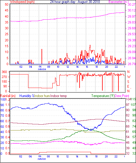 Maximum gust speed = 16 mph from 315 °( NW) on day 30 at time 16:50