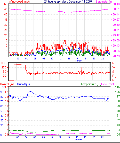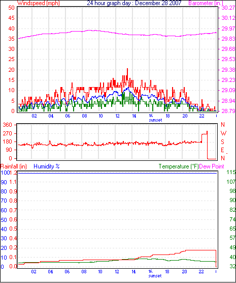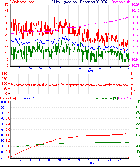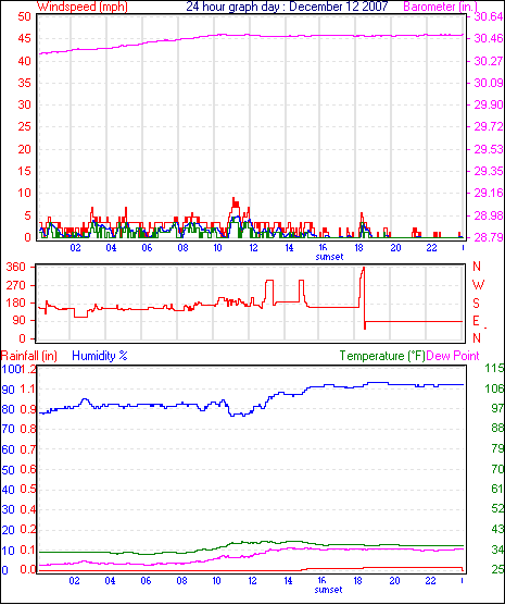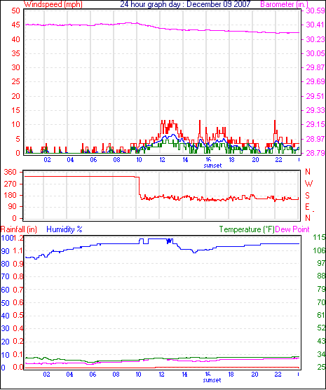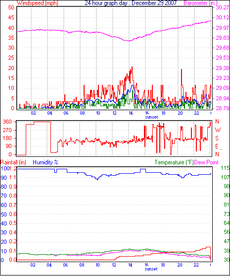 Averages\Extremes for the month of December to 30 2007 ------------------------------------------------------------ Average temperature 38.4 °F Average humidity 93 % Average dewpoint 36.5 °F Average barometer 30.08 in. Average windspeed 5.4 mph Average gustspeed 8.1 mph Average direction 157 ° (SSE) Rainfall for month 8.96 in. Rainfall for year 37.67 in. ----------------------------------------------------------- Maximum rain per minute 0.01 in. on day 03 at time 23:31 Maximum temperature 57.0 °F on day 04 at time 12:50 Minimum temperature 28.8 °F on day 09 at time 06:10 Maximum humidity 100 % on day 30 at time 00:07 Minimum humidity 50 % on day 16 at time 14:03 Maximum pressure 30.61 in. on day 24 at time 18:23 Minimum pressure 29.49 in. on day 18 at time 07:17 Maximum windspeed 28.8 mph from 171° on day 03 at time 11:14 Maximum gust speed 42.6 mph from 179° on day 03 at time 02:31 Maximum heat index 57.0 °F on day 04 at time 12:50 Growing degrees days : 32.0 °F ------------------------------------------------------------ Daily rain totals 0.19 in. on day 1 1.61 in. on day 2 1.72 in. on day 3 0.05 in. on day 4 0.01 in. on day 5 0.28 in. on day 6 0.01 in. on day 7 0.01 in. on day 9 0.05 in. on day 10 0.02 in. on day 12 0.04 in. on day 14 0.05 in. on day 15 0.21 in. on day 16 0.17 in. on day 17 0.48 in. on day 18 0.78 in. on day 19 0.29 in. on day 20 0.01 in. on day 21 0.22 in. on day 22 0.75 in. on day 23 0.23 in. on day 24 0.07 in. on day 25 0.28 in. on day 26 0.74 in. on day 27 0.21 in. on day 28 0.17 in. on day 29 0.30 in. on day 30 ------------------------------------------------------------