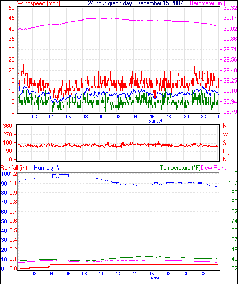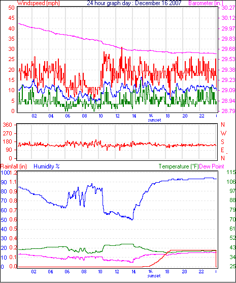 Averages\Extremes for day :01 ------------------------------------------------------------Average temperature 33.2 °F (0.7 °C) Average humidity 94 % Average dewpoint 31.6 °F (-0.2 °C) Average barometer 29.679 in. Average windspeed 8.2 mph Average gustspeed 12.3 mph Average direction 156 ° (SSE) Rainfall for month 0.200 in. (5.1 mm) Rainfall for year 28.909 in. (734 mm) ----------------------------------------------------------- Maximum rain per minute 0.000 in. ( 0 mm) on day 01 at time 00:01 Maximum temperature 36.7 °F (2.6 °C) on day 01 at time 00:07 Minimum temperature 30.6 °F (-0.8 °C) on day 01 at time 09:08 Minimum pressure 29.6 in. on day 01 at time 18:00 Maximum pressure 29.8 in. on day 30 at time 00:09 Maximum windspeed 22.0 mph from 180° on day 01 at time 17:11 Maximum gust speed 33.0 mph from 169° on day 01 at time 17:10 Maximum humidity 100 % on day 01 at time 00:07 Minimum humidity 84 % on day 01 at time 07:52 Maximum heat index 36.7 °F (2.6 °C) on day 01 at time 00:07 Rain for the day :0.190 in Click here for todays 24 hour graph :1 :12 :2007 ------------------------------------------------------------ Averages\Extremes for day :02 ------------------------------------------------------------ Average temperature 41.1 °F (5.0 °C) Average humidity 99 % Average dewpoint 40.8 °F (4.9 °C) Average barometer 29.632 in. Average windspeed 16.3 mph Average gustspeed 23.5 mph Average direction 159 ° (SSE) Rainfall for month 1.810 in. (46.0 mm) Rainfall for year 30.519 in. (775 mm) ----------------------------------------------------------- Maximum rain per minute 0.000 in. ( 0 mm) on day 02 at time 00:03 Maximum temperature 47.7 °F (8.7 °C) on day 02 at time 00:07 Minimum temperature 35.8 °F (2.1 °C) on day 01 at time 00:32 Minimum pressure 29.6 in. on day 02 at time 10:37 Maximum pressure 29.7 in. on day 02 at time 03:57 Maximum windspeed 26.0 mph from 169° on day 02 at time 12:20 Maximum gust speed 41.0 mph from 159° on day 02 at time 10:55 Maximum humidity 100 % on day 02 at time 00:07 Minimum humidity 96 % on day 02 at time 00:03 Maximum heat index 47.7 °F (8.7 °C) on day 02 at time 00:07 Rain for the day :1.610 in Click here for todays 24 hour graph :2 :12 :2007 ------------------------------------------------------------ Averages\Extremes for day :03 ------------------------------------------------------------ Average temperature 52.5 °F (11.4 °C) Average humidity 100 % Average dewpoint 52.5 °F (11.4 °C) Average barometer 29.747 in. Average windspeed 17.7 mph Average gustspeed 24.9 mph Average direction 160 ° (SSE) Rainfall for month 3.520 in. (89.4 mm) Rainfall for year 32.229 in. (819 mm) ----------------------------------------------------------- Maximum rain per minute 0.000 in. ( 0 mm) on day 03 at time 23:31 Maximum temperature 54.5 °F (12.5 °C) on day 03 at time 21:54 Minimum temperature 47.7 °F (8.7 °C) on day 02 at time 00:28 Minimum pressure 29.6 in. on day 02 at time 00:13 Maximum pressure 30.0 in. on day 03 at time 23:59 Maximum windspeed 29.0 mph from 176° on day 03 at time 11:14 Maximum gust speed 43.0 mph from 166° on day 03 at time 02:31 Maximum humidity 100 % on day 03 at time 00:07 Minimum humidity 96 % on day 02 at time 00:28 Maximum heat index 54.5 °F (12.5 °C) on day 03 at time 21:54 Rain for the day :1.721 in Click here for todays 24 hour graph :3 :12 :2007 ------------------------------------------------------------ Averages\Extremes for day :04 ------------------------------------------------------------ Average temperature 52.8 °F (11.6 °C) Average humidity 87 % Average dewpoint 48.9 °F (9.4 °C) Average barometer 30.219 in. Average windspeed 7.5 mph Average gustspeed 10.4 mph Average direction 164 ° (SSE) Rainfall for month 3.570 in. (90.7 mm) Rainfall for year 32.279 in. (820 mm) ----------------------------------------------------------- Maximum rain per minute 0.000 in. ( 0 mm) on day 04 at time 09:10 Maximum temperature 57.0 °F (13.9 °C) on day 04 at time 12:56 Minimum temperature 47.7 °F (8.7 °C) on day 04 at time 00:07 Minimum pressure 30.0 in. on day 03 at time 00:12 Maximum pressure 30.3 in. on day 04 at time 20:17 Maximum windspeed 16.0 mph from 181° on day 04 at time 07:23 Maximum gust speed 24.0 mph from 171° on day 04 at time 05:27 Maximum humidity 100 % on day 04 at time 09:14 Minimum humidity 70 % on day 04 at time 14:16 Maximum heat index 57.0 °F (13.9 °C) on day 04 at time 12:56 Rain for the day :0.050 in Click here for todays 24 hour graph :4 :12 :2007 ------------------------------------------------------------ Averages\Extremes for day :05 ------------------------------------------------------------ Average temperature 44.0 °F (6.7 °C) Average humidity 97 % Average dewpoint 43.0 °F (6.1 °C) Average barometer 30.160 in. Average windspeed 0.6 mph Average gustspeed 1.1 mph Average direction 347 ° (NNW) Rainfall for month 3.590 in. (91.2 mm) Rainfall for year 32.299 in. (820 mm) ----------------------------------------------------------- Maximum rain per minute 0.000 in. ( 0 mm) on day 05 at time 18:52 Maximum temperature 47.6 °F (8.7 °C) on day 04 at time 00:17 Minimum temperature 40.8 °F (4.9 °C) on day 05 at time 21:22 Minimum pressure 30.0 in. on day 05 at time 00:06 Maximum pressure 30.3 in. on day 05 at time 02:21 Maximum windspeed 5.0 mph from 156° on day 05 at time 22:01 Maximum gust speed 7.0 mph from 152° on day 05 at time 22:00 Maximum humidity 100 % on day 05 at time 22:17 Minimum humidity 87 % on day 04 at time 00:19 Maximum heat index 47.6 °F (8.7 °C) on day 04 at time 00:17 Rain for the day :0.010 in Click here for todays 24 hour graph :5 :12 :2007 ------------------------------------------------------------ Averages\Extremes for day :06 ------------------------------------------------------------ Average temperature 41.3 °F (5.2 °C) Average humidity 100 % Average dewpoint 41.2 °F (5.1 °C) Average barometer 29.860 in. Average windspeed 1.1 mph Average gustsp