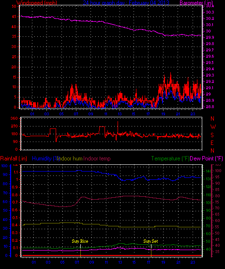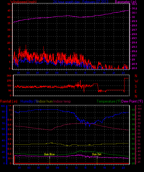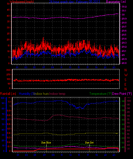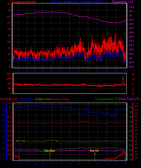 Maximum windspeed = 18.4 mph from 180°( S ) on day 06 at time 21:41