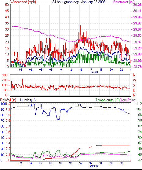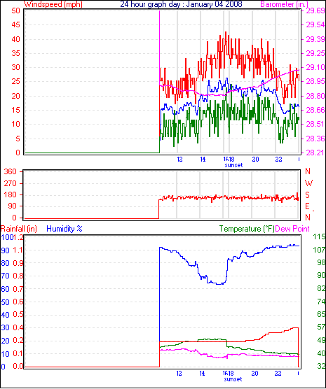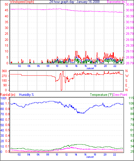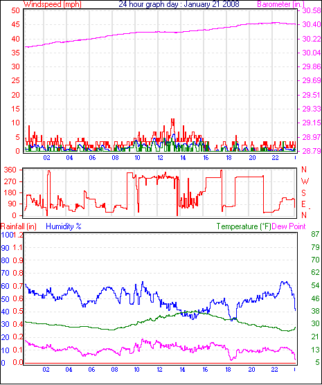 Averages\Extremes for the month of January to 31 2008 ------------------------------------------------------------ Average temperature 35.8 °F Average humidity 86 % Average dewpoint 31.3 °F Average barometer 29.98 in. Average windspeed 4.8 mph Average gustspeed 7.4 mph Average direction 152 ° (SSE) Rainfall for month 5.09 in. Rainfall for year 5.09 in. ----------------------------------------------------------- Maximum rain per minute 0.01 in. on day 31 at time 21:57 Maximum temperature 50.8 °F on day 04 at time 06:24 Minimum temperature 24.6 °F on day 24 at time 05:47 Maximum humidity 100 % on day 31 at time 23:59 Minimum humidity 22 % on day 22 at time 14:52 Maximum pressure 30.65 in. on day 15 at time 12:00 Minimum pressure 28.80 in. on day 04 at time 14:21 Maximum windspeed 33.4 mph from 139° on day 04 at time 16:12 Maximum gust speed 46.0 mph from 171° on day 04 at time 20:52 Maximum heat index 50.8 °F on day 04 at time 06:24 Growing degrees days : 32.0 °F ------------------------------------------------------------ Daily rain totals 0.45 in. on day 2 0.32 in. on day 3 0.36 in. on day 4 0.32 in. on day 5 0.22 in. on day 6 0.26 in. on day 7 0.44 in. on day 8 0.31 in. on day 9 0.21 in. on day 10 0.23 in. on day 11 0.52 in. on day 12 0.01 in. on day 13 0.22 in. on day 14 0.04 in. on day 15 0.08 in. on day 19 0.32 in. on day 26 0.02 in. on day 27 0.09 in. on day 28 0.12 in. on day 29 0.17 in. on day 30 0.38 in. on day 31 ------------------------------------------------------------