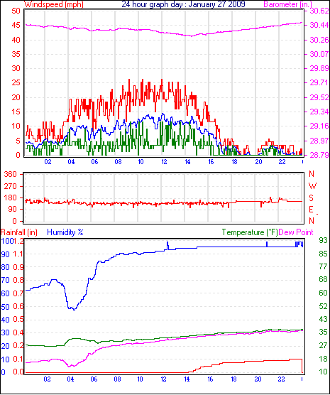 Maximum windspeed = 18.4 mph from 135 °( SE) on day 27 at time 11:54
