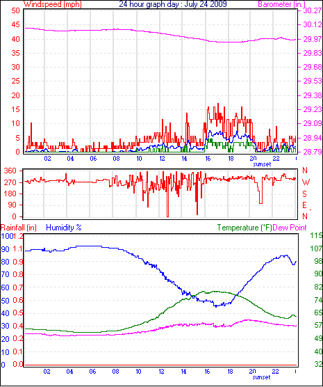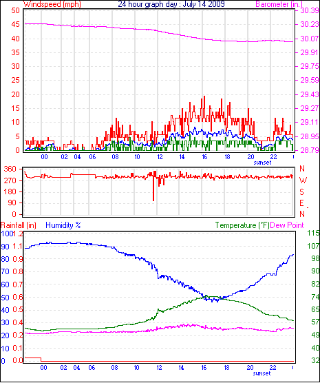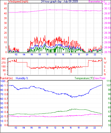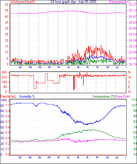 Maximum gust speed = 17 mph from 293 °(WNW) on day 30 at time 23:38