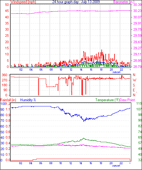 Maximum windspeed = 13.8 mph from 293 °(WNW) on day 01 at time 23:42