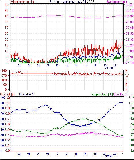 Maximum gust speed = 17 mph from 293 °(WNW) on day 01 at time 00:20