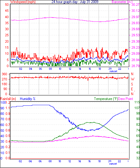 Maximum gust speed = 18 mph from 293 °(WNW) on day 31 at time 18:53