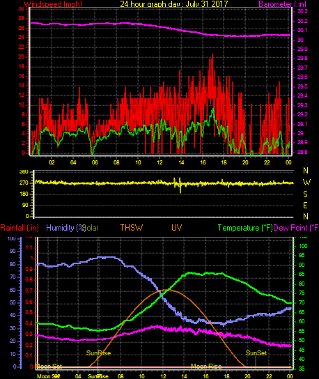 Maximum windspeed = 12.7 mph from 265°( W ) on day 31 at time 16:52