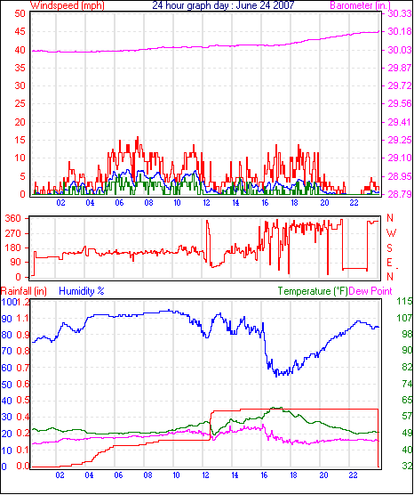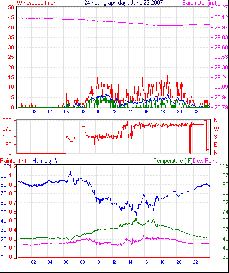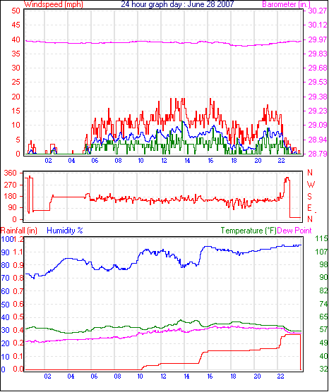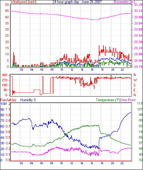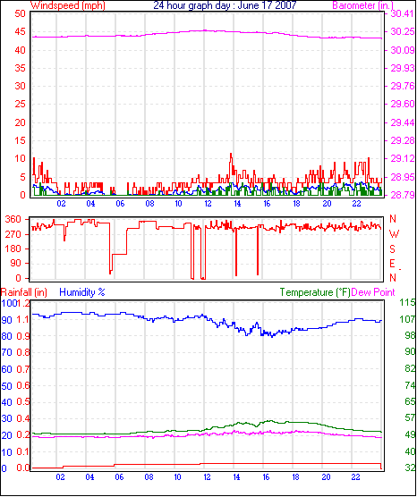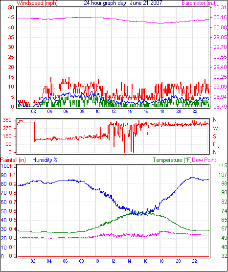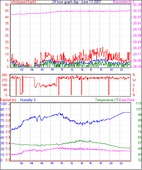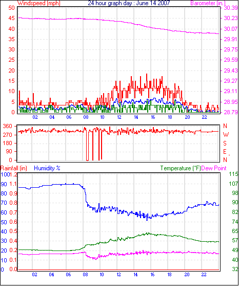 Averages\Extremes for the month of June to 30 2007 ------------------------------------------------------------ Average temperature 56.8 °F Average humidity 76 % Average dewpoint 48.5 °F Average barometer 30.04 in. Average windspeed 2.7 mph Average gustspeed 4.7 mph Average direction 292 ° (WNW) Rainfall for month 0.08 in. Rainfall for year 17.15 in. ----------------------------------------------------------- Maximum rain per minute 0.06 in. on day 24 at time 12:31 Maximum temperature 83.8 °F on day 26 at time 16:49 Minimum temperature 43.4 °F on day 12 at time 06:41 Maximum humidity 100 % on day 29 at time 08:34 Minimum humidity 21 % on day 26 at time 17:33 Maximum pressure 30.29 in. on day 25 at time 10:21 Minimum pressure 29.81 in. on day 01 at time 17:49 Maximum windspeed 17.3 mph from 125° on day 09 at time 13:50 Maximum gust speed 28.8 mph from 113° on day 09 at time 13:30 Maximum heat index 81.5 °F on day 26 at time 15:04 Growing degrees days : 294.4 °F ------------------------------------------------------------ Daily rain totals 0.02 in. on day 4 0.03 in. on day 5 0.02 in. on day 7 0.20 in. on day 9 0.36 in. on day 10 0.10 in. on day 15 0.15 in. on day 16 0.04 in. on day 17 0.41 in. on day 24 0.02 in. on day 25 0.32 in. on day 28 0.34 in. on day 29 ------------------------------------------------------------