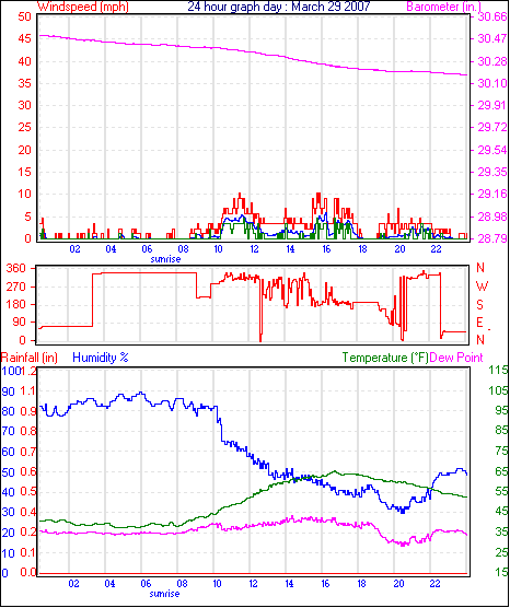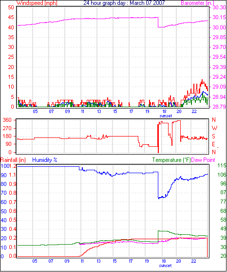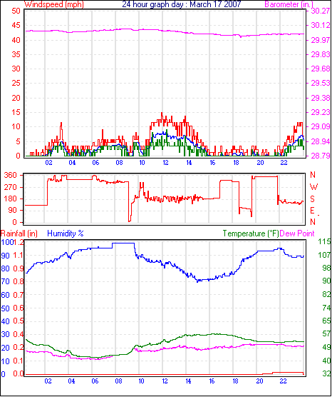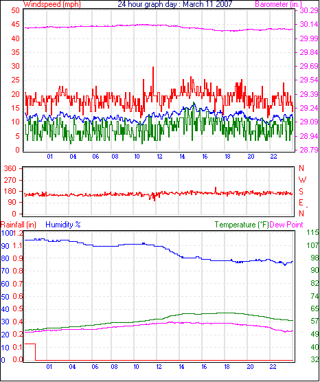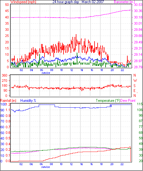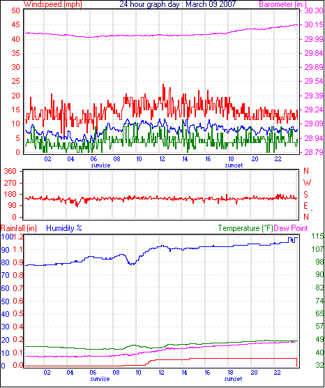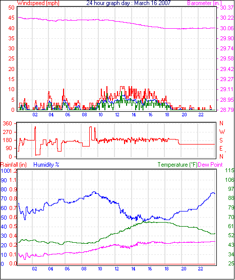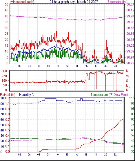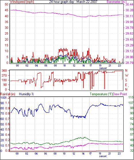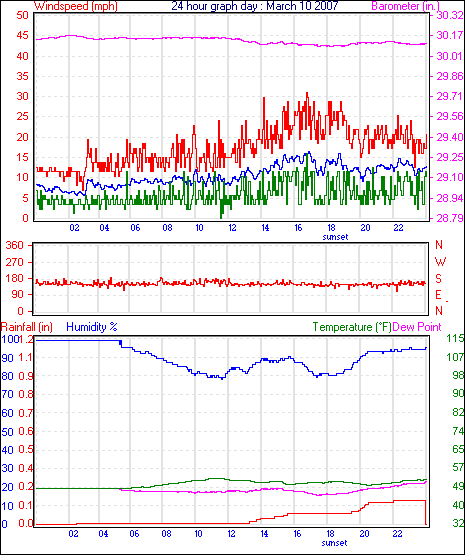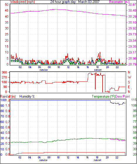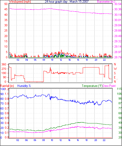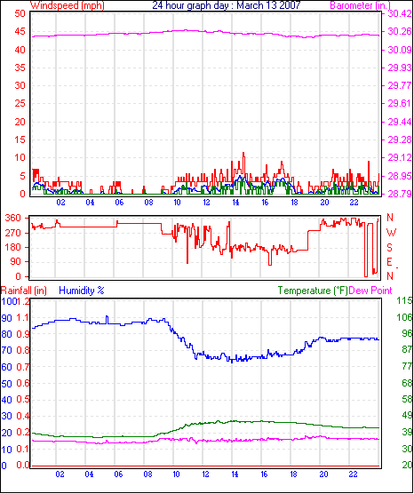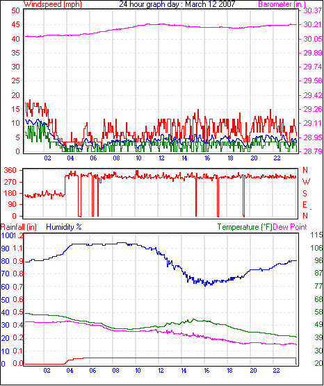 Averages\Extremes for the month of March to 31 2007 ------------------------------------------------------------ Average temperature 46.5 °F Average humidity 81 % Average dewpoint 40.7 °F Average barometer 30.13 in. Average windspeed 4.1 mph Average gustspeed 6.2 mph Average direction 169 ° ( S ) Rainfall for month 0.11 in. Rainfall for year 11.11 in. ----------------------------------------------------------- Maximum rain per minute 0.05 in. on day 19 at time 15:04 Maximum temperature 66.3 °F on day 16 at time 15:26 Minimum temperature 31.6 °F on day 01 at time 03:19 Maximum humidity 100 % on day 31 at time 11:05 Minimum humidity 30 % on day 29 at time 20:33 Maximum pressure 30.59 in. on day 28 at time 10:38 Minimum pressure 29.74 in. on day 26 at time 15:48 Maximum windspeed 21.9 mph from 164° on day 10 at time 16:48 Maximum gust speed 31.1 mph from 164° on day 10 at time 16:48 Maximum heat index 79.1 °F on day 16 at time 18:44 Growing degrees days : 75.6 °F ------------------------------------------------------------ Daily rain totals 0.24 in. on day 7 0.07 in. on day 9 0.15 in. on day 10 0.06 in. on day 12 0.08 in. on day 14 0.02 in. on day 17 0.36 in. on day 19 0.14 in. on day 20 0.01 in. on day 22 0.05 in. on day 23 0.71 in. on day 24 0.11 in. on day 25 0.04 in. on day 26 0.02 in. on day 27 0.01 in. on day 30 0.16 in. on day 31 ------------------------------------------------------------