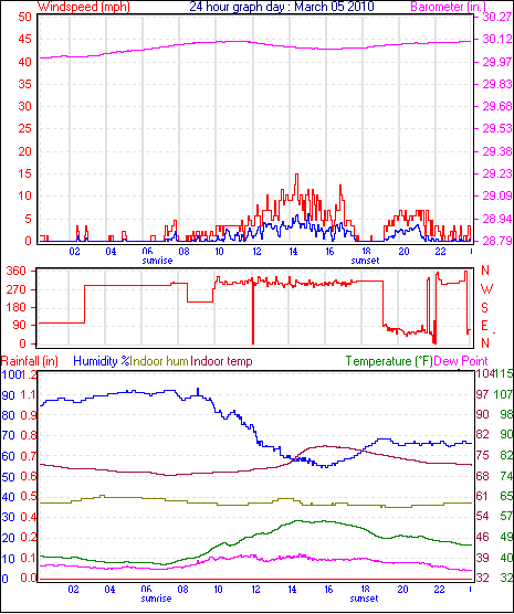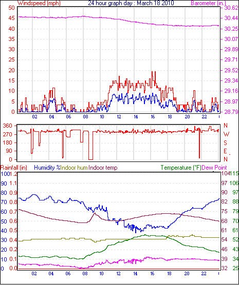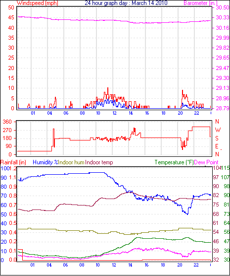 Maximum gust speed = 14 mph from 315 °( NW) on day 03 at time 12:18