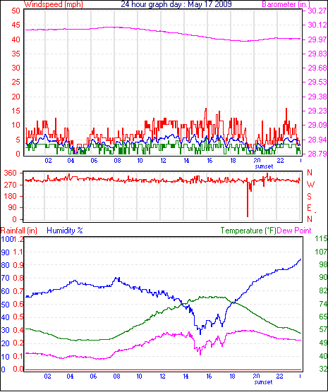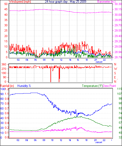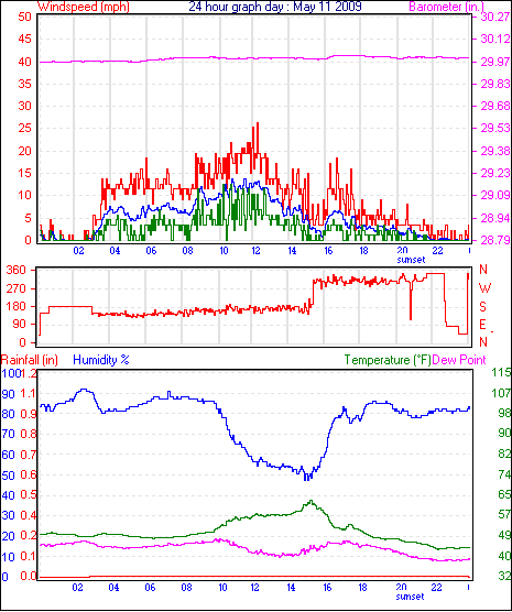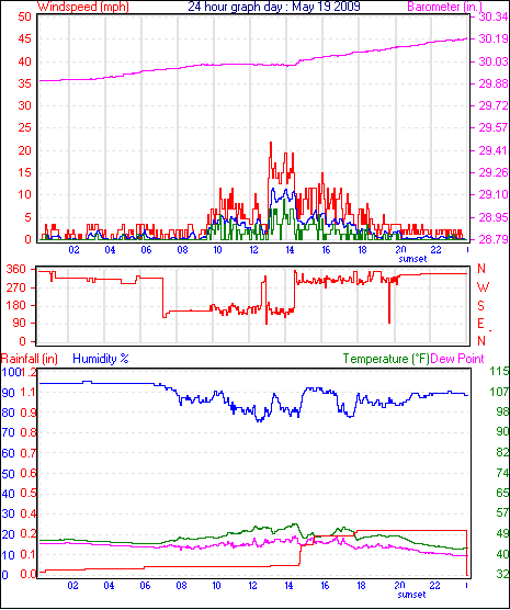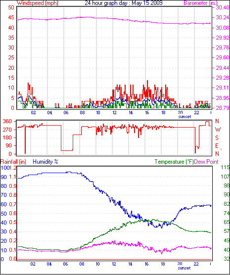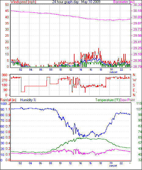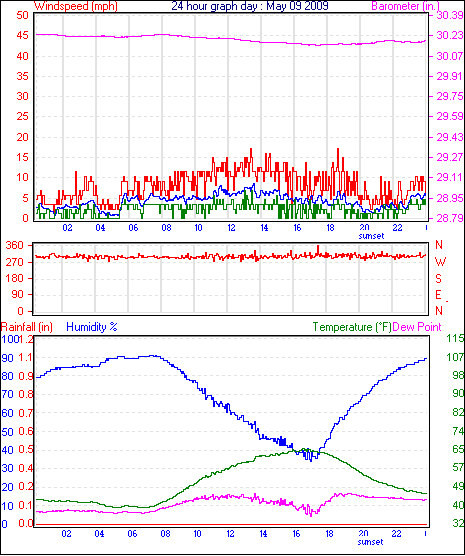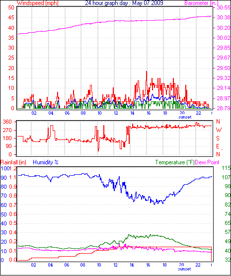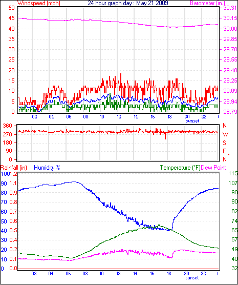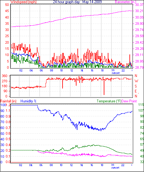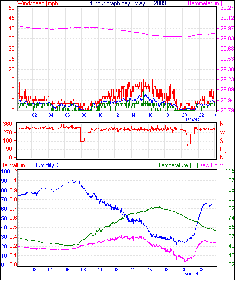 Maximum gust speed = 16 mph from 293 °(WNW) on day 30 at time 15:36