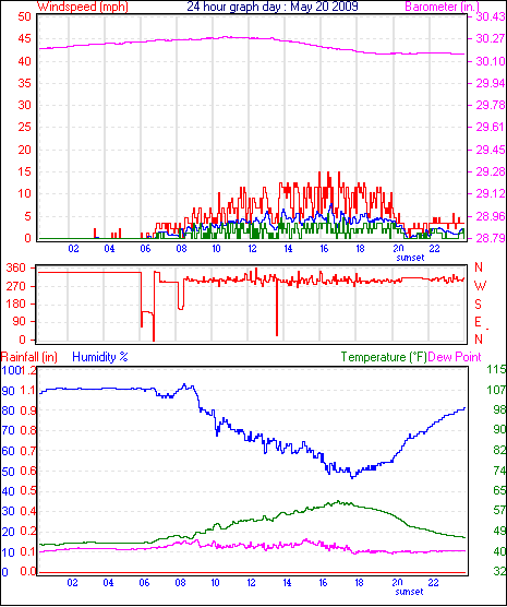 Maximum gust speed = 20 mph from 293 °(WNW) on day 29 at time 15:49