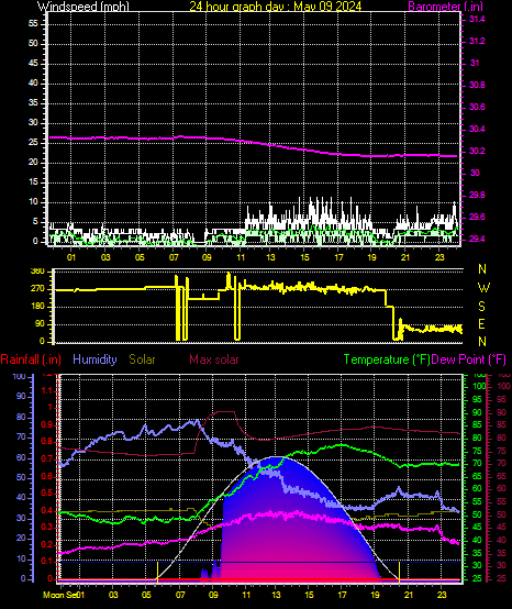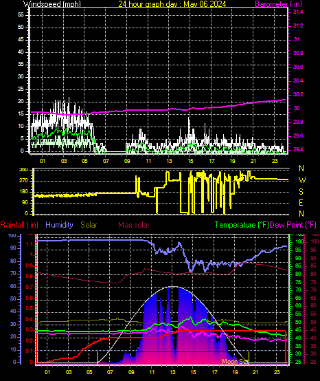 Maximum windspeed = 13.8 mph from 138°( SE) on day 06 at time 02:59