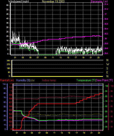 Maximum windspeed = 18.4 mph from 169°( S ) on day 19 at time 00:25
