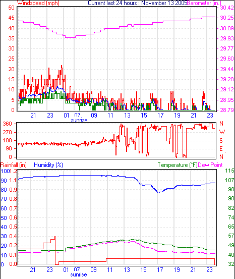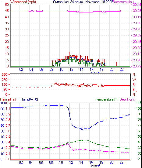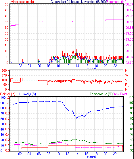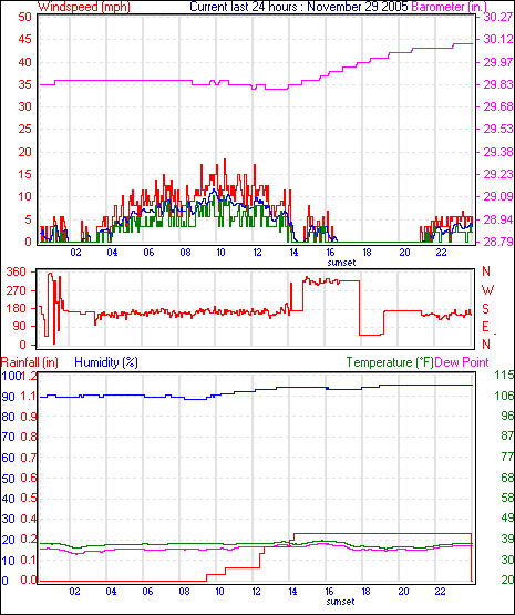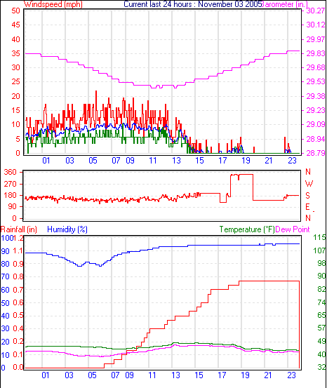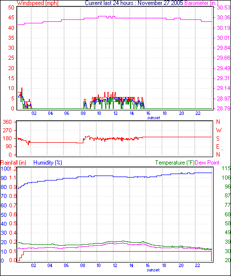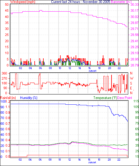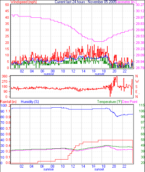 Averages\Extremes for the month of November to 30 2005 --------------------------------------------------- Average temperature 41.7 °F (5.4 °C) Average humidity 85 % Average dewpoint 37.1 °F (2.8 °C) Average barometer 30.114 in. Average windspeed 2.3 mph Average gustspeed 3.2 mph Average direction 165 ° (SSE) Rainfall for month 6.378 in. (159 mm) Rainfall for year 11.614 in. (290 mm) ----------------------------------------------------------- Maximum rain per minute 0.079 in. ( 2 mm) on day 29 at time 12:26 Maximum temperature 54.3 °F (12.4 °C) on day 13 at time 14:11 Minimum temperature 29.1 °F (-1.6 °C) on day 28 at time 05:09 Maximum humidity 97 % on day 28 at time 08:22 Minimum humidity 47 % on day 28 at time 14:23 Minimum pressure 29.412 in. on day 05 at time 18:25 Maximum pressure 30.593 in. on day 15 at time 11:24 Maximum windspeed 17.0 mph from 201 on day 05 at time 18:41 Maximum gust speed 26.0 mph from 100 on day 05 at time 13:44 Maximum heat index 54.3 °F (12.4 °C)on day 13 at time 14:11 Growing degrees days : -2.0 °F ------------------------------------------------------------ Daily rain totals 0.945 in. (23.6 mm) on day 1 0.787 in. (19.7 mm) on day 3 0.512 in. (12.8 mm) on day 4 0.472 in. (11.8 mm) on day 5 0.118 in. (3.0 mm) on day 6 0.236 in. (5.9 mm) on day 7 0.118 in. (3.0 mm) on day 10 0.512 in. (12.8 mm) on day 11 0.354 in. (8.9 mm) on day 12 0.079 in. (2.0 mm) on day 13 0.315 in. (7.9 mm) on day 24 1.299 in. (32.5 mm) on day 25 0.039 in. (1.0 mm) on day 26 0.118 in. (3.0 mm) on day 27 0.157 in. (3.9 mm) on day 28 0.276 in. (6.9 mm) on day 29 ------------------------------------------------------------