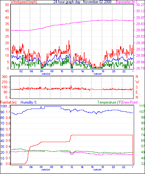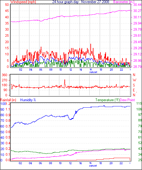 Maximum gust speed = 18 mph from 135 °( SE) on day 03 at time 06:07