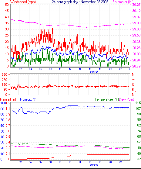 Maximum gust speed = 32.2 mph from 135 °( SE) on day 08 at time 06:48
