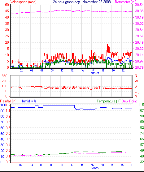 Maximum gust speed = 18 mph from 135 °( SE) on day 28 at time 19:09