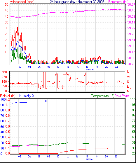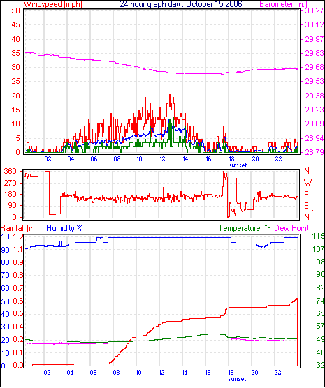 Averages\Extremes for the month of October to 31 2006 ------------------------------------------------------------ Average temperature 51.7 °F Average humidity 81 % Average dewpoint 45.2 °F Average barometer 1019 mb Average windspeed 1.7 mph Average gustspeed 3.0 mph Average direction 310 ° ( NW) Rainfall for month 1.920 in. Rainfall for year 32.19 in. ----------------------------------------------------------- Maximum rain per minute 0.02 in. on day 29 at time 11:27 Maximum temperature 83.2 °F on day 27 at time 15:58 Minimum temperature 32.1 °F on day 31 at time 05:37 Maximum humidity 100 % on day 29 at time 06:42 Minimum humidity 23 % on day 27 at time 23:59 Maximum pressure 30.48 in. on day 26 at time 10:30 Minimum pressure 29.60 in. on day 15 at time 17:34 Maximum windspeed 16.1 mph from 171° on day 15 at time 12:57 Maximum gust speed 21.9 mph from 317° on day 29 at time 15:04 Maximum heat index 81.7 °F on day 27 at time 15:30 Growing degrees days : 182.8 °F ------------------------------------------------------------ Daily rain totals 0.02 in. on day 4 0.04 in. on day 12 0.62 in. on day 15 0.13 in. on day 16 0.15 in. on day 18 0.40 in. on day 19 0.21 in. on day 24 0.01 in. on day 28 0.15 in. on day 29 ------------------------------------------------------------